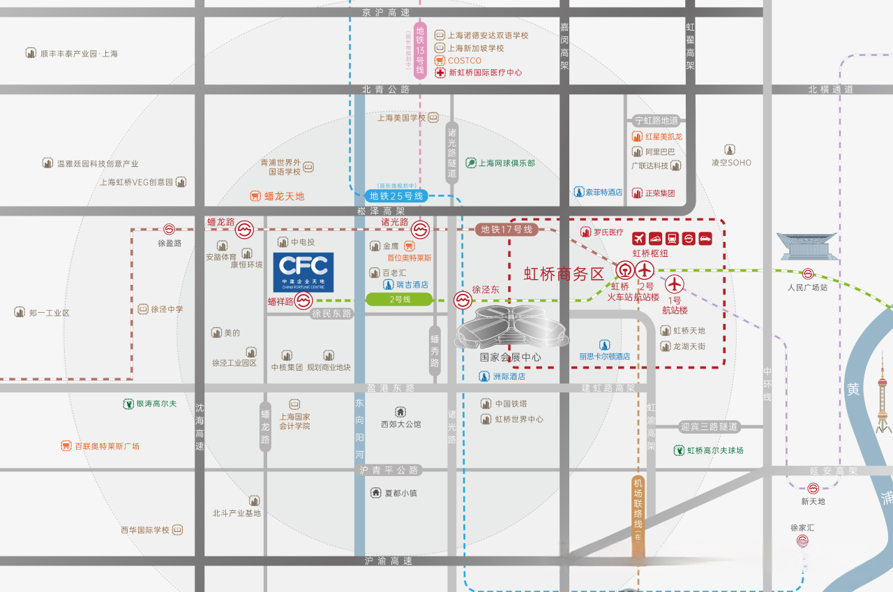 轨道交通:项目位于2号线蟠祥路地铁站上盖,可快速换乘2号线(国家会展中心)、10号线、17号线(蟠龙路站),以及在建的13号线延伸、25号线和规划中的27号线、机场联络线,共7条轨交线路。