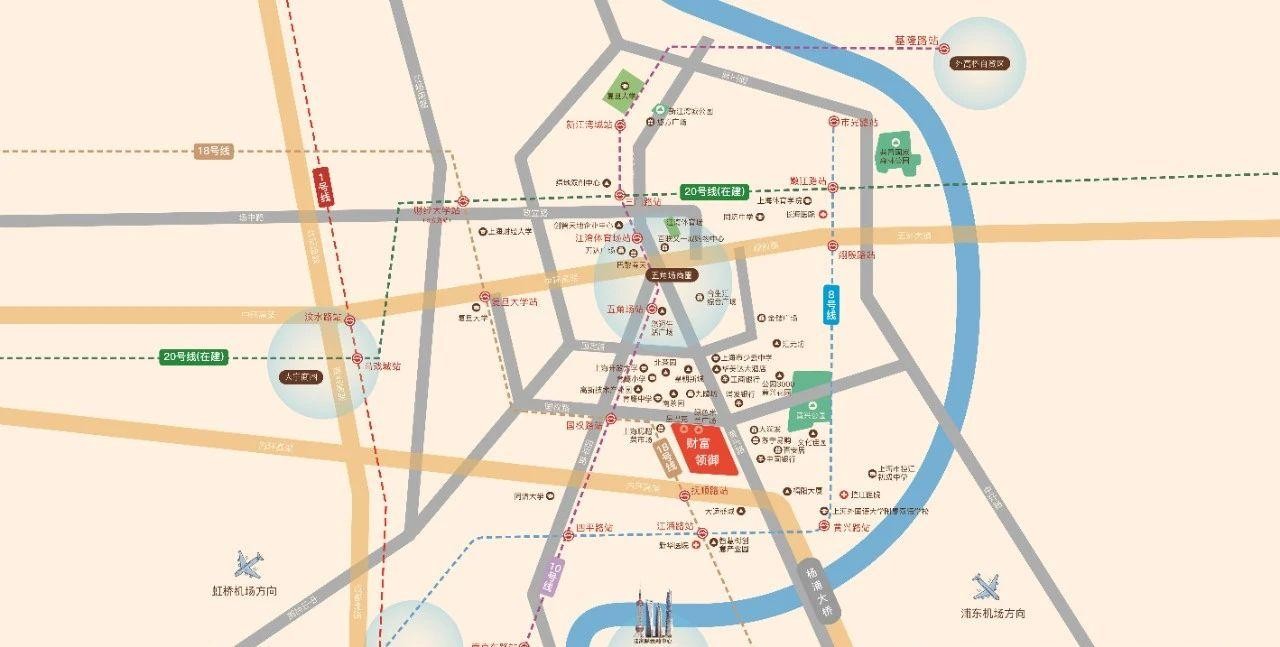 62.4万方黄兴公园500米左右;区域内复旦大学,同济大学、上海财经大学、上海体育学院等高等品牌学府约1.5公里左右,享受人才聚集红利
